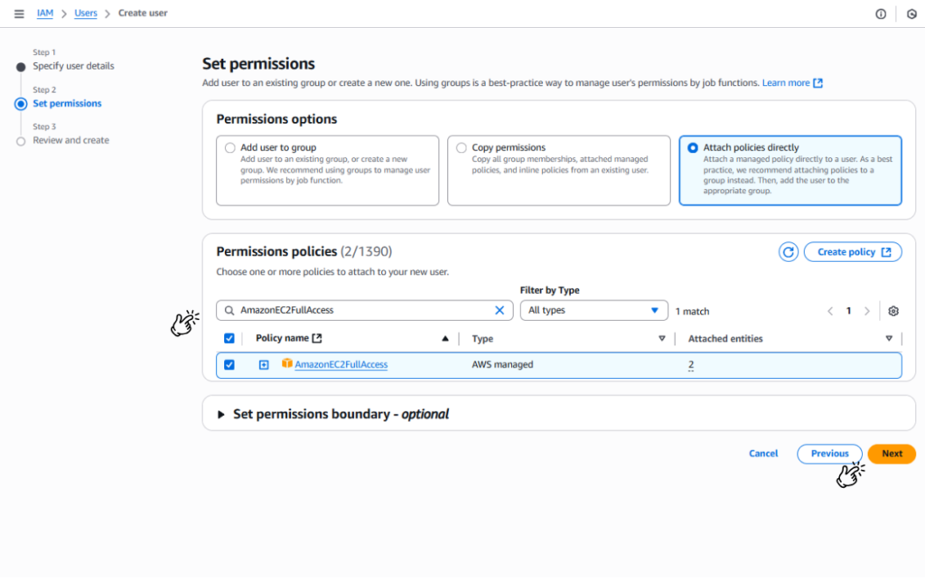 - Select Attach policies directly.