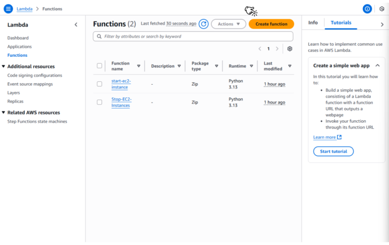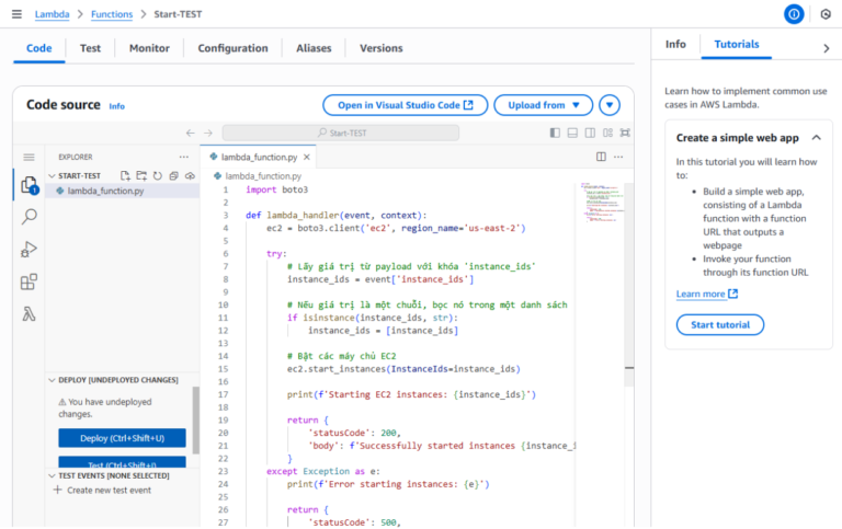 • Lặp lại các bước trên, đặt tên là stop-ec2-instance và thay thế ec2.start_instances bằng ec2.stop_instances trong code.