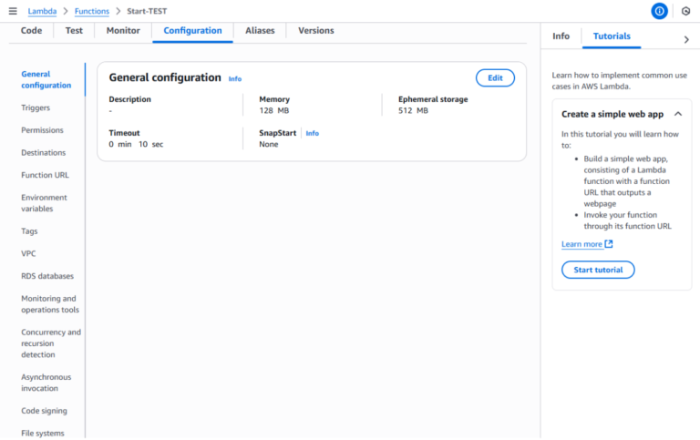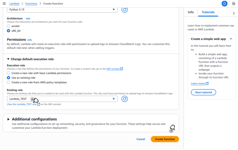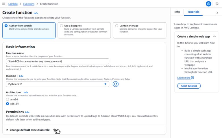 • Chọn Author from scratch, đặt tên start-ec2-instance, chọn Python 3.12 làm Runtime và chọn Role IAM bạn đã tạo ở bước trên.