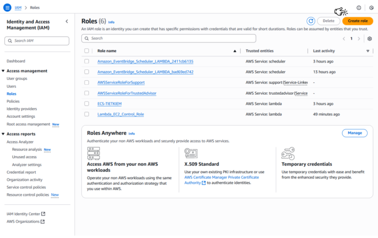 • Trong giao diện IAM, bạn click vào nút Create role ở góc trên cùng bên phải.