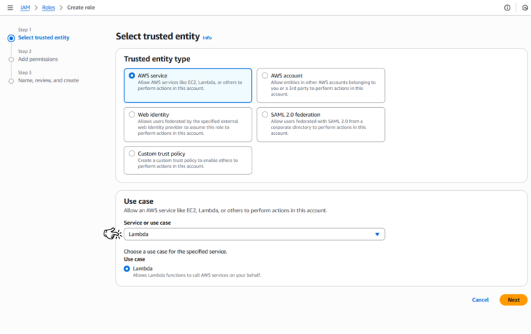 • Trong phần Use case, chọn Lambda, sau đó nhấn Next. Điều này sẽ đảm bảo role được cấu hình để sử dụng với AWS Lambda.