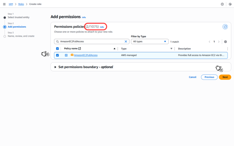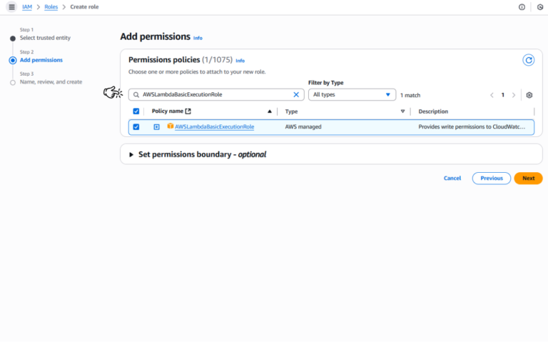 • Trong thanh tìm kiếm “Add permissions”, bạn gõ AWSLambdaBasicExecutionRole. Chọn chính sách này từ danh sách kết quả. * Tiếp tục tìm kiếm và chọn AmazonEC2FullAccess (hoặc một chính sách có quyền hạn thấp hơn như AmazonEC2ReadOnlyAccess nếu bạn chỉ muốn đọc thông tin).