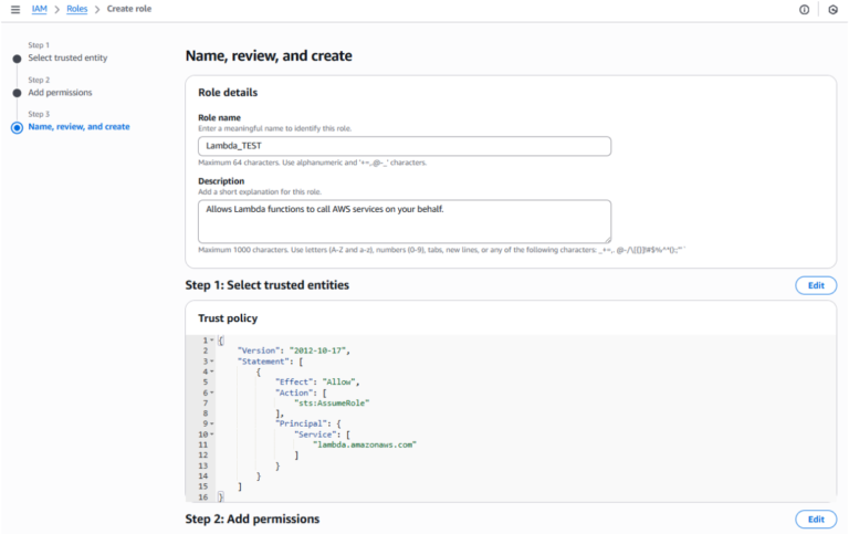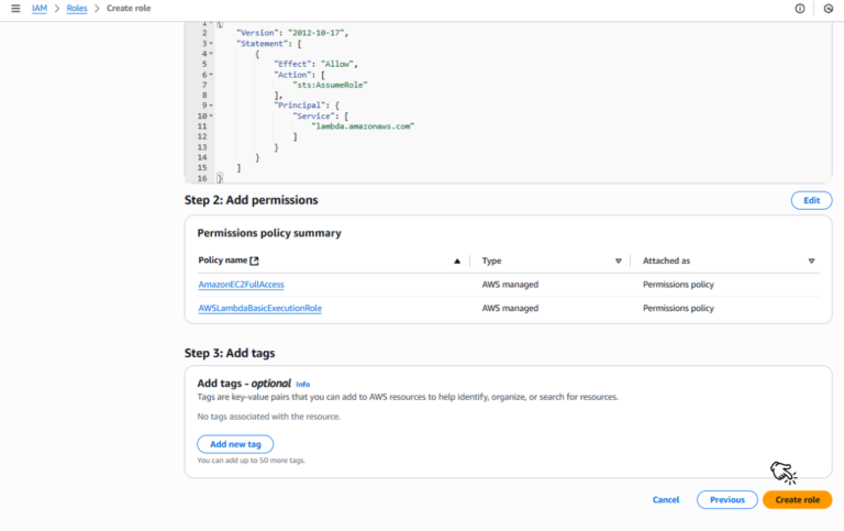 Sau khi role này được tạo, bạn có thể gán nó cho hàm Lambda để hàm có đủ quyền truy cập cần thiết vào dịch vụ EC2