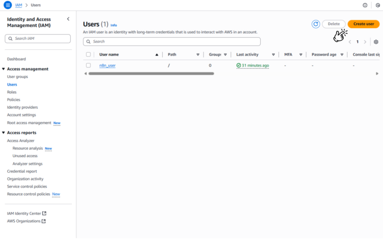 1. Tạo người dùng IAM: (mục đích sử dụng để thiết lập AWS account trên n8n)