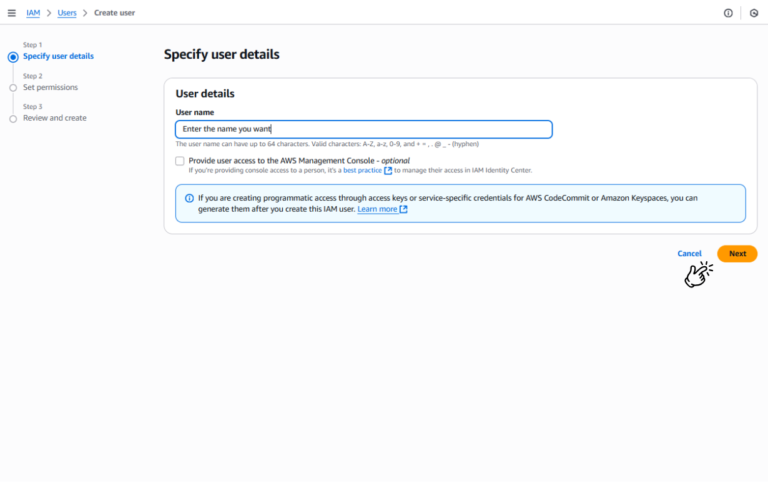 • Đặt tên cho người dùng (ví dụ: n8n-ec2-controller) và nhấn Next.