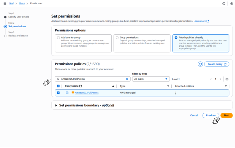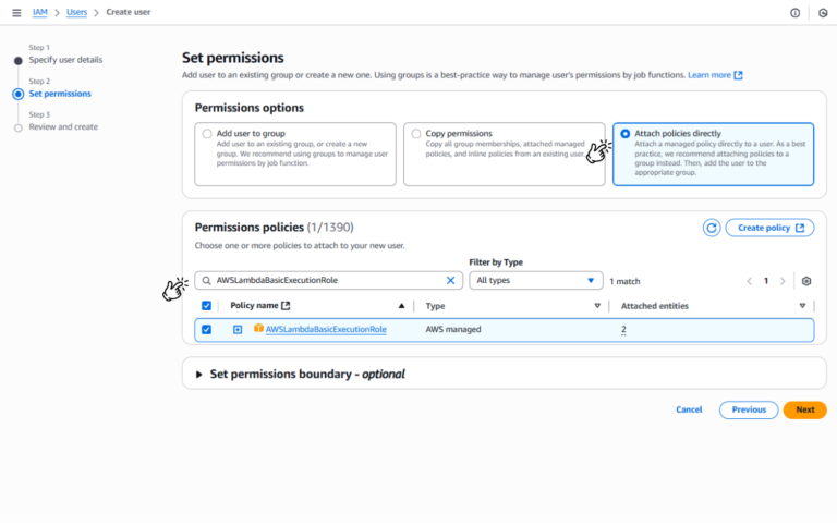 Trước hết, bạn cần tạo một người dùng IAM chuyên dụng và cấp cho nó các quyền cần thiết để tương tác với các dịch vụ AWS.